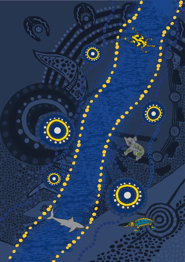 Parramatta River is symbolised through the yellow dots running from top to bottom, and the totems represent our Indigenous players coming together at the various meeting points along the River; they include our training facilities, administration office, Parramatta Leagues Club, and our new stadium.
