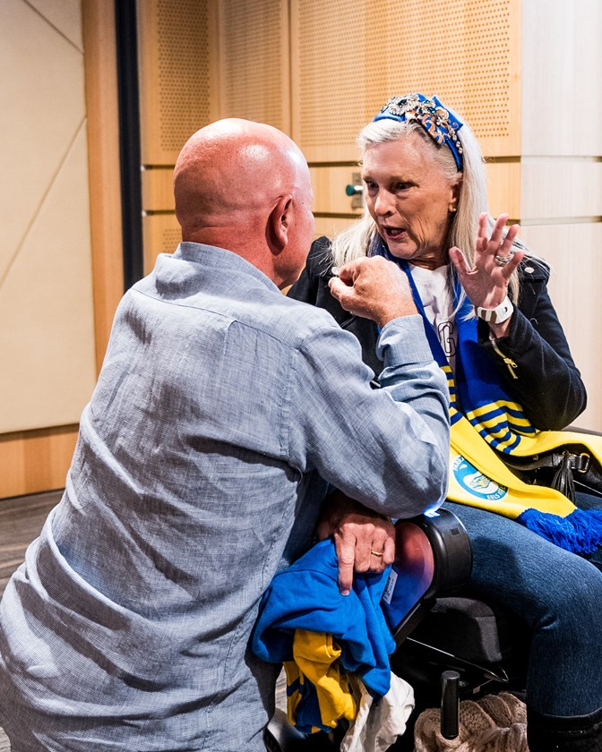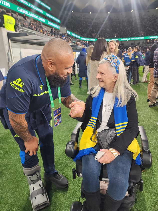 After learning Jo's story, Eels Chairman Sean McElduff arranged a spot on the sideline so she could cheer her beloved Blue & Gold onto the field for the Battle of the West.