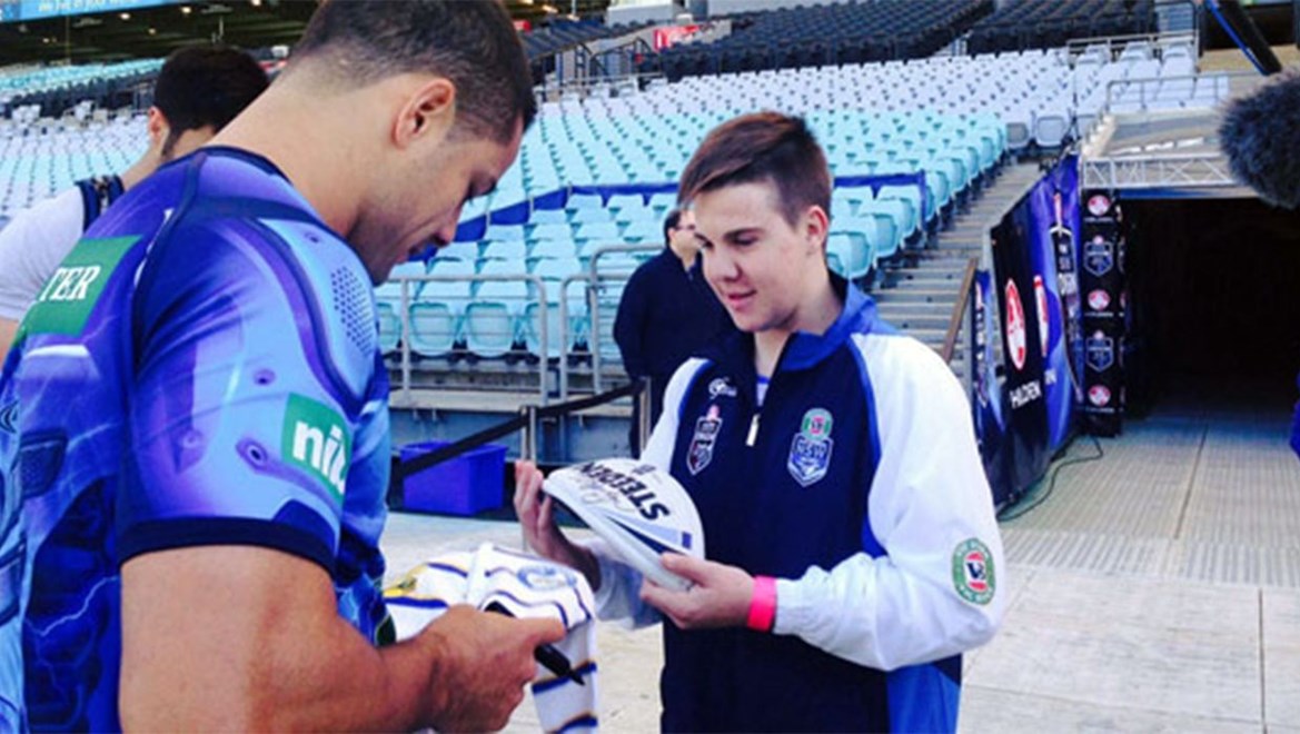 Tye got to visit the locker room, observe the warm up and cool down session and join the players on the field at ANZ Stadium for a kick. Tye was even given a special origin football signed by the whole team for him to keep. We just couldn't wipe the smile off Tye's face when he met his idol, Paramatta fullback Jarryd Hayne!