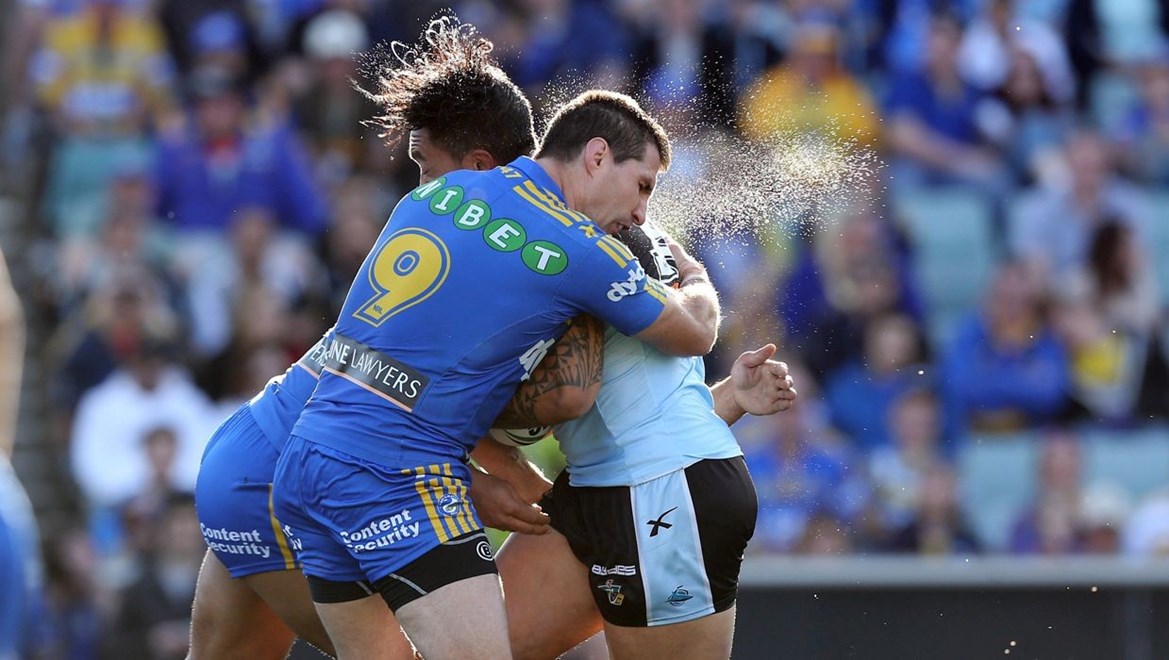 A kick out on the full from the Sharks’ Wade Graham in the 43rd minute gave the Eels a great attacking opportunity but Ryan Morgan was held up in-goal early in the tackle count.