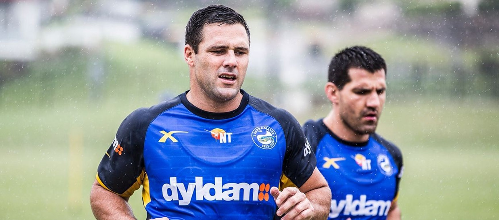 Photos of the Dyldam Parramatta Eels, including new recruits Kieran Foran, Michael Gordon and Beau Scott, who hit the training paddock in wet conditions this morning.