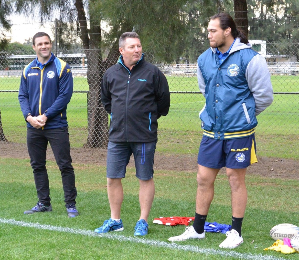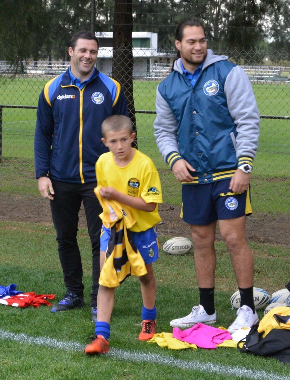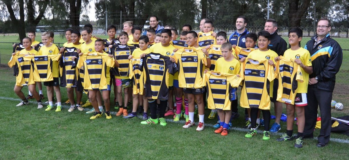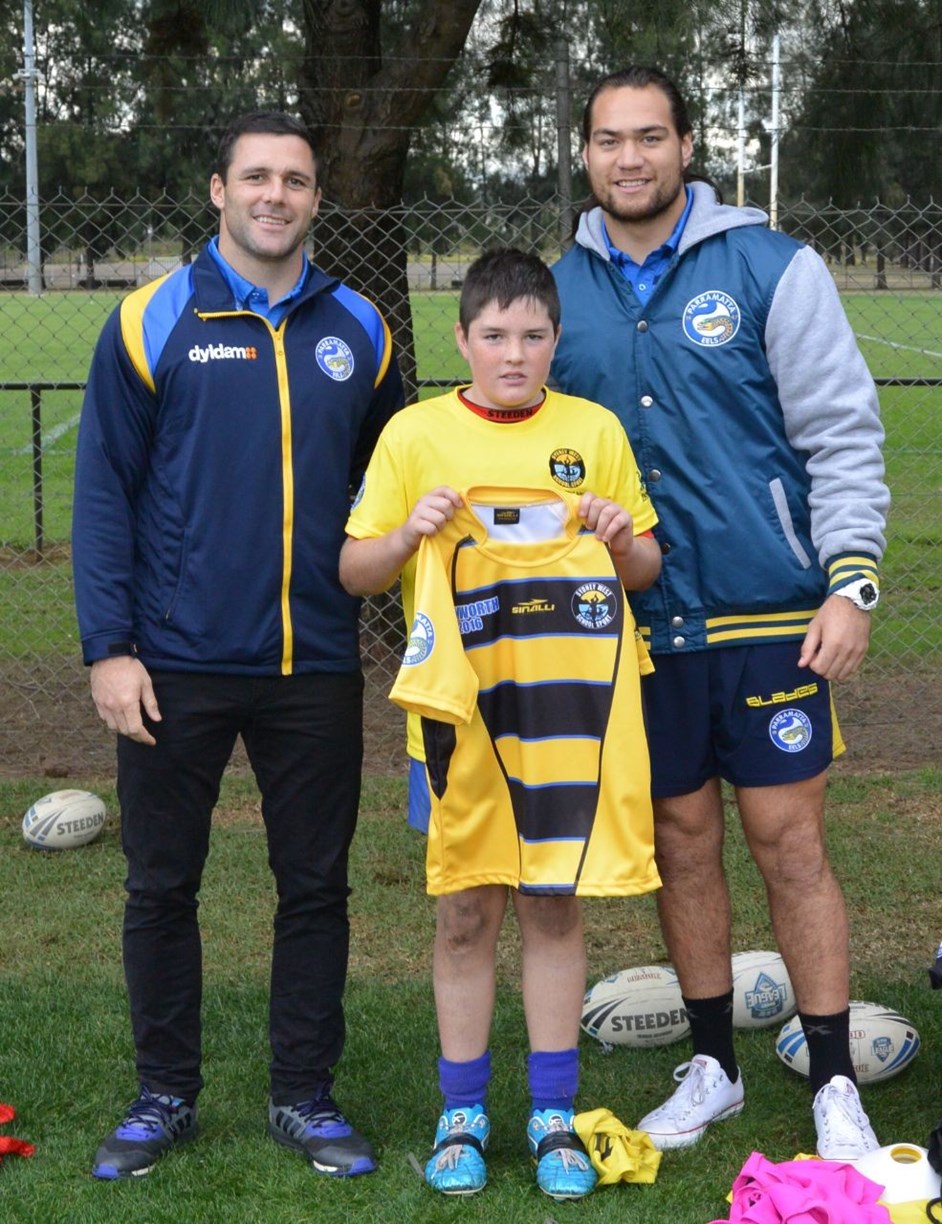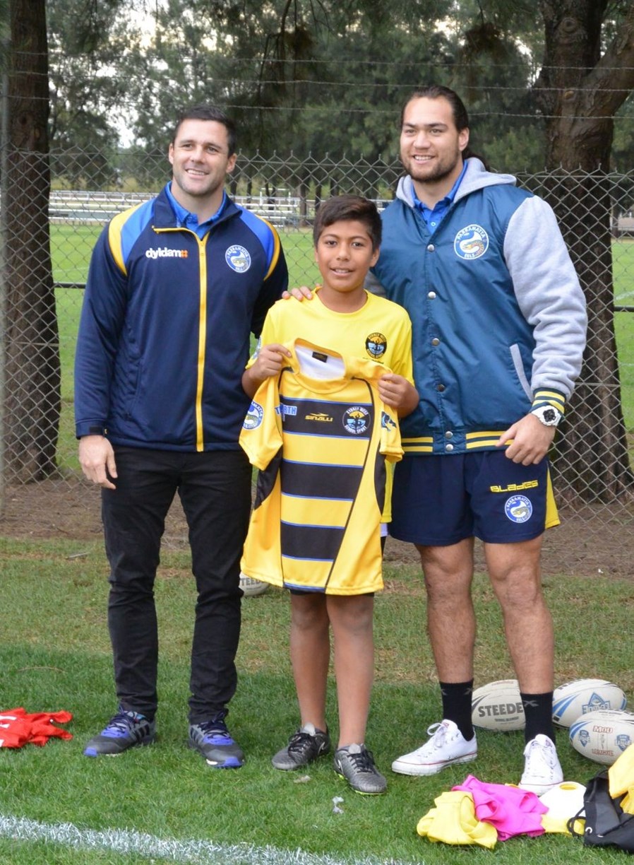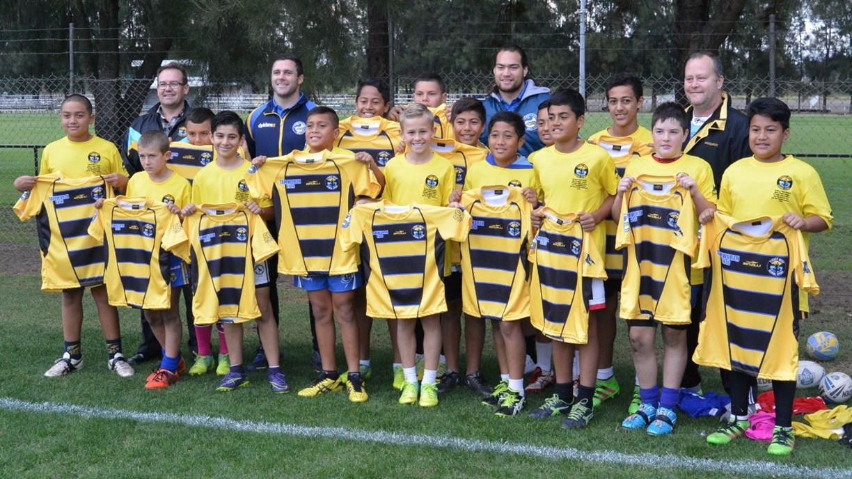 Dyldam Parramatta Eels Tepai Moeroa and Michael Gordon recently attended the annual jersey presentation for the NSWPSSA South West teams, presenting the 34 Sydney West Rugby League players their jerseys ahead of their respective carnivals