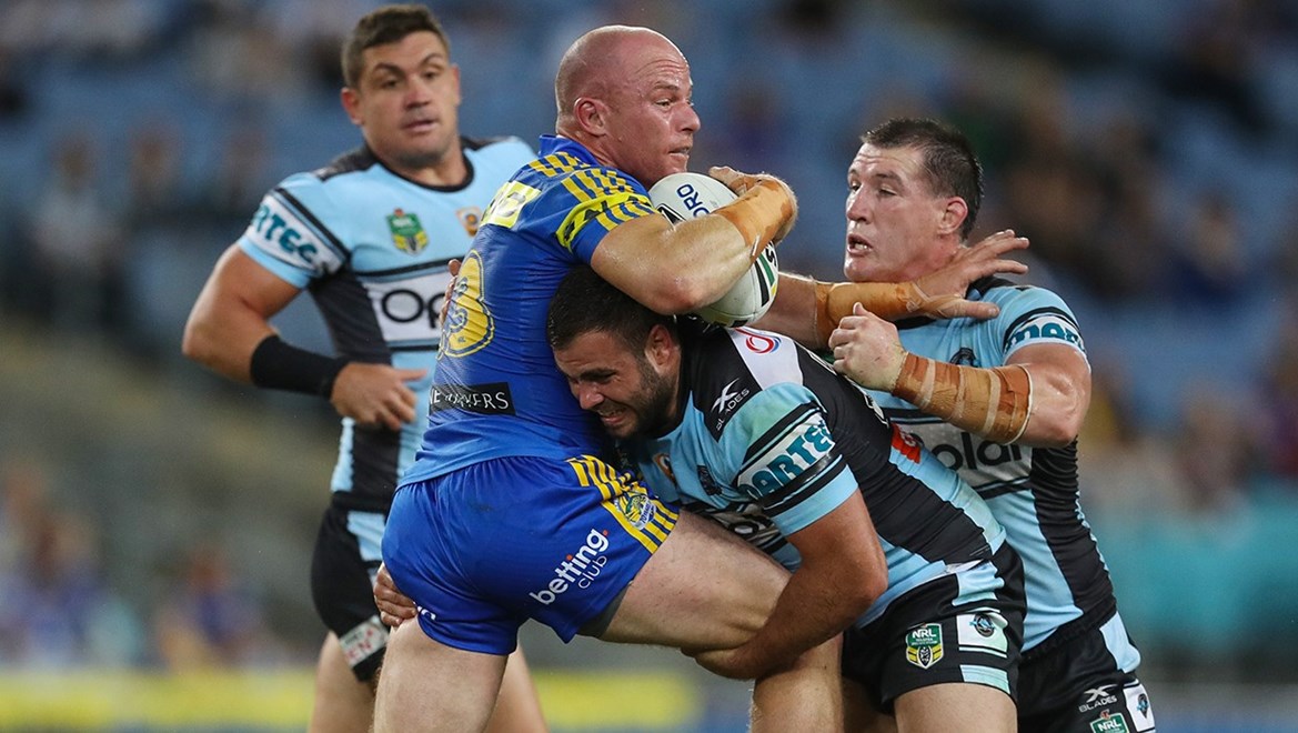 The Eels attempted to hit back minutes later as Frank Pritchard launched himself at the Sharks try-line. Solid Sharks goal-line defence caused him to lose the ball, however.