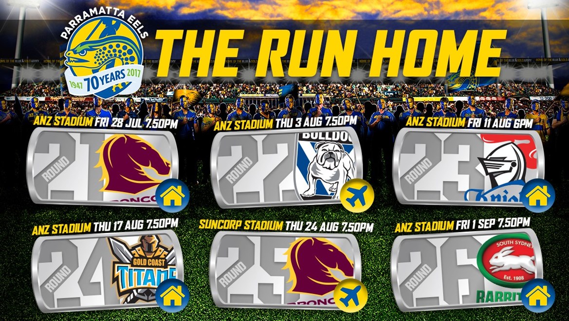 The Eels have four home games in the run home, coming up against the Brisbane Broncos, Newcastle Knights, Gold Coast Titans and South Sydney Rabbitohs.