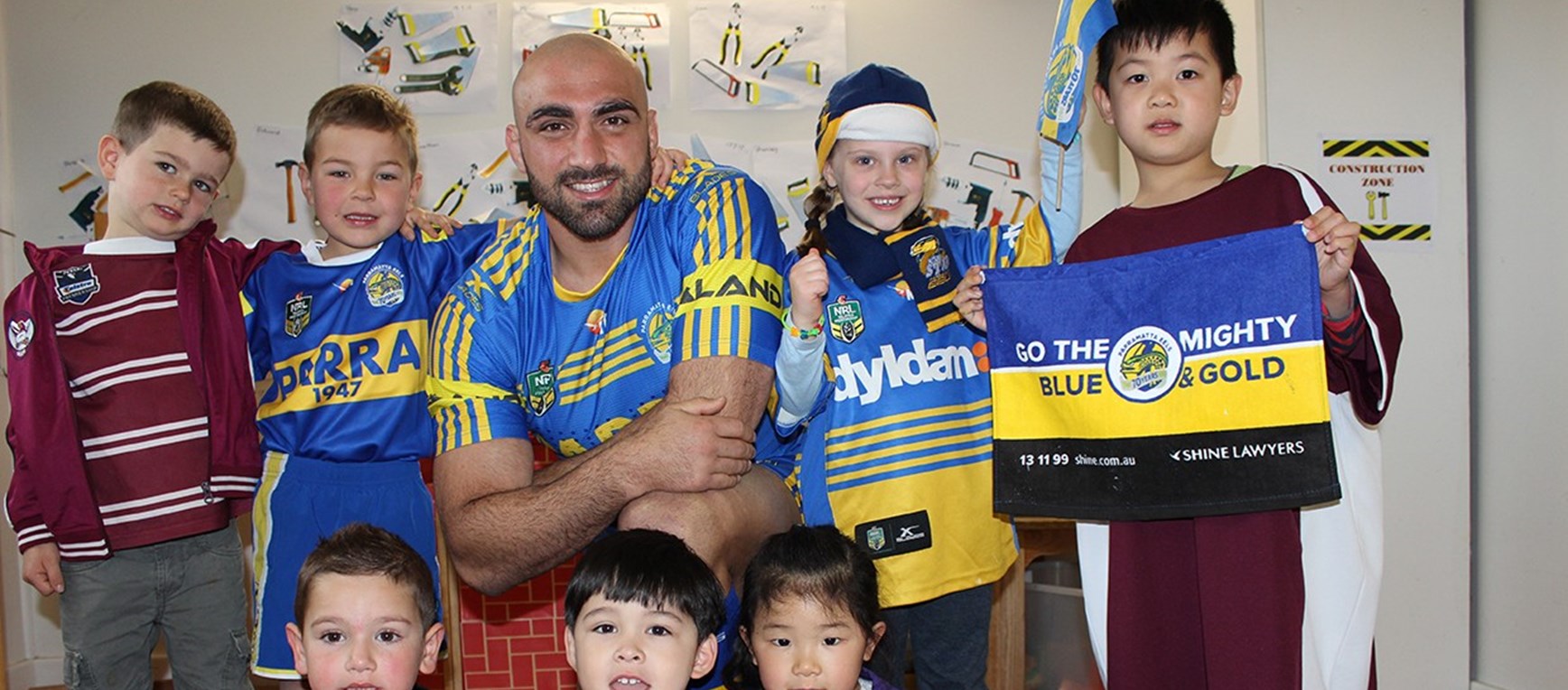 Parramatta Eels co-captain Tim Mannah and Footy Colours Day Ambassador has today (Tuesday 15 August) paid a visit to the North Rocks Child Care Centre on their chosen Footy Colours Day in support of the Fight Cancer Foundation.