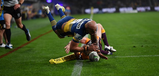 The Eels posed a constant threat with the football but the Broncos scrambled well until Mika Sivo put the ball down with one hand, with the rest of his body elevated over the touchline.
