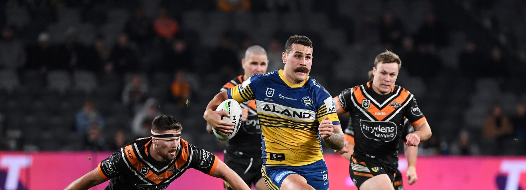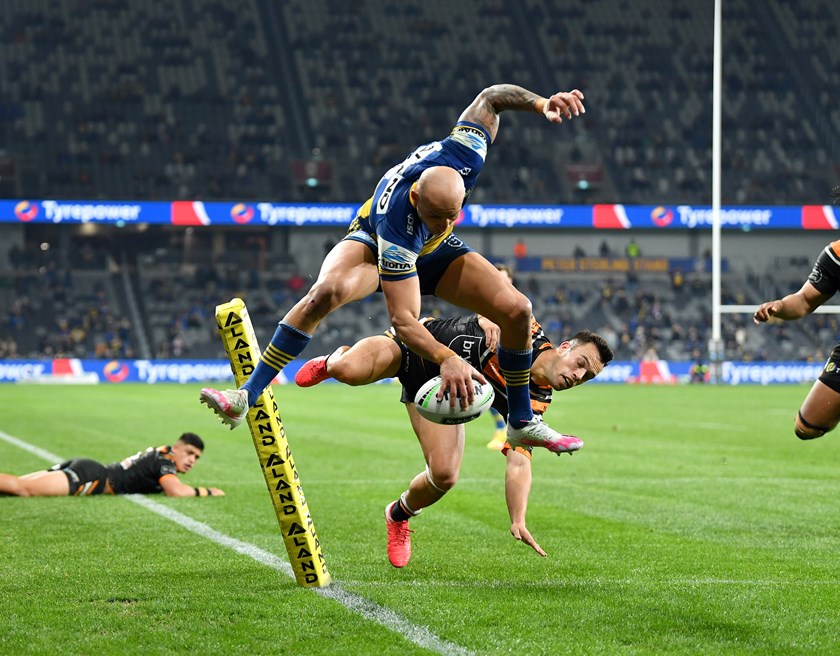 The Eels his back when Maiko Sivo powered over the top of Adam Doueihi in the ninth minute, the Tigers fullback placed on report for a possible shoulder charge having braced for impact.
