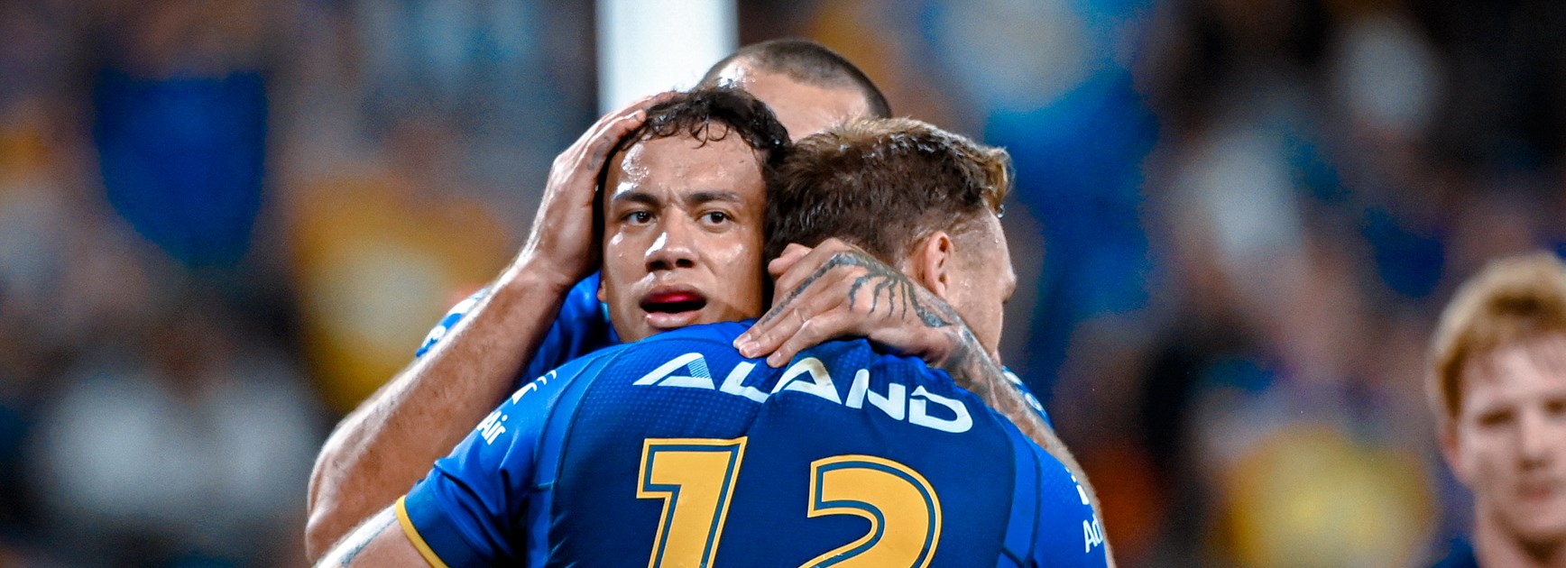 J’maine Hopgood played the ball to Joe Ofahengaue close to the line, and the Eels prop powered through four defenders to score his first Parramatta try.